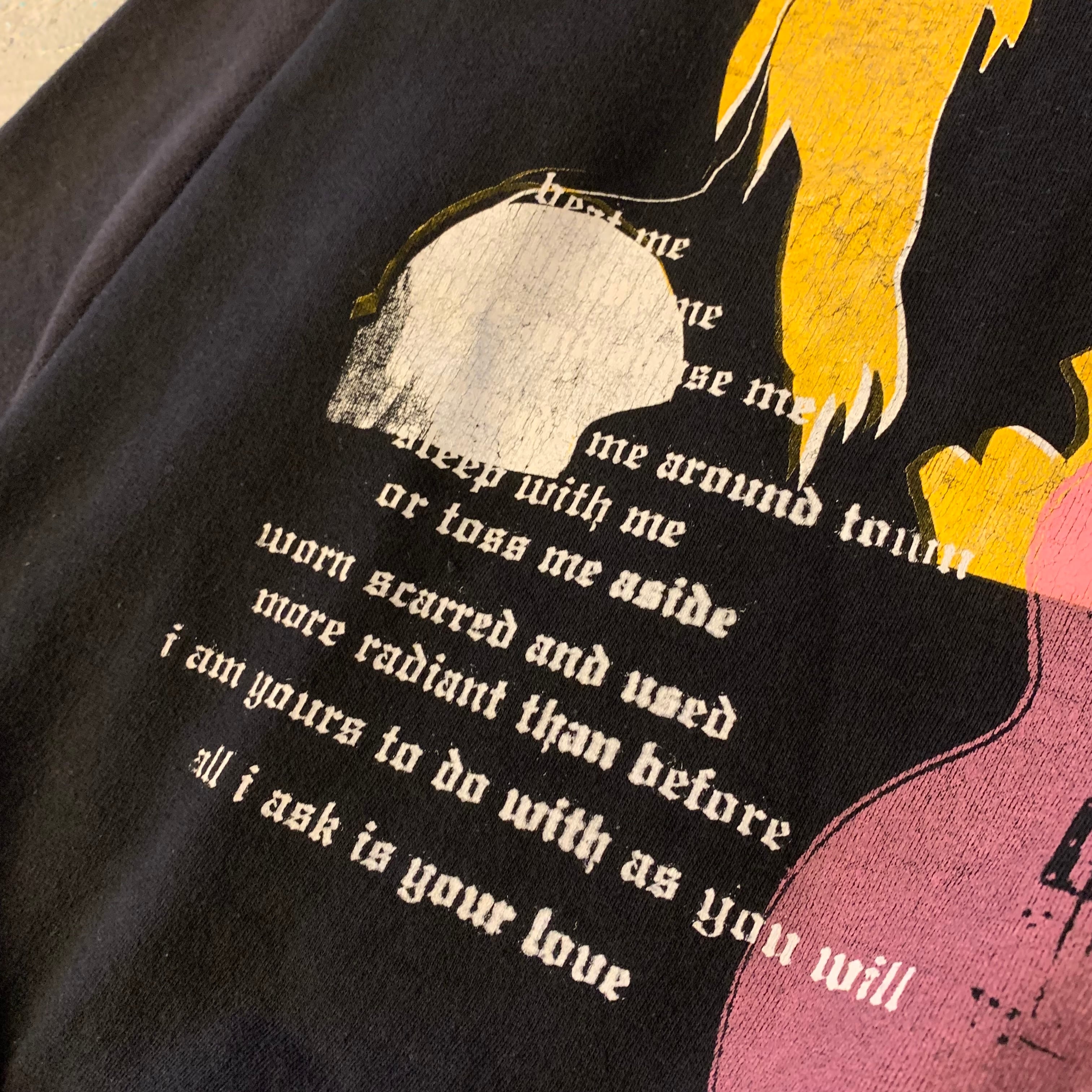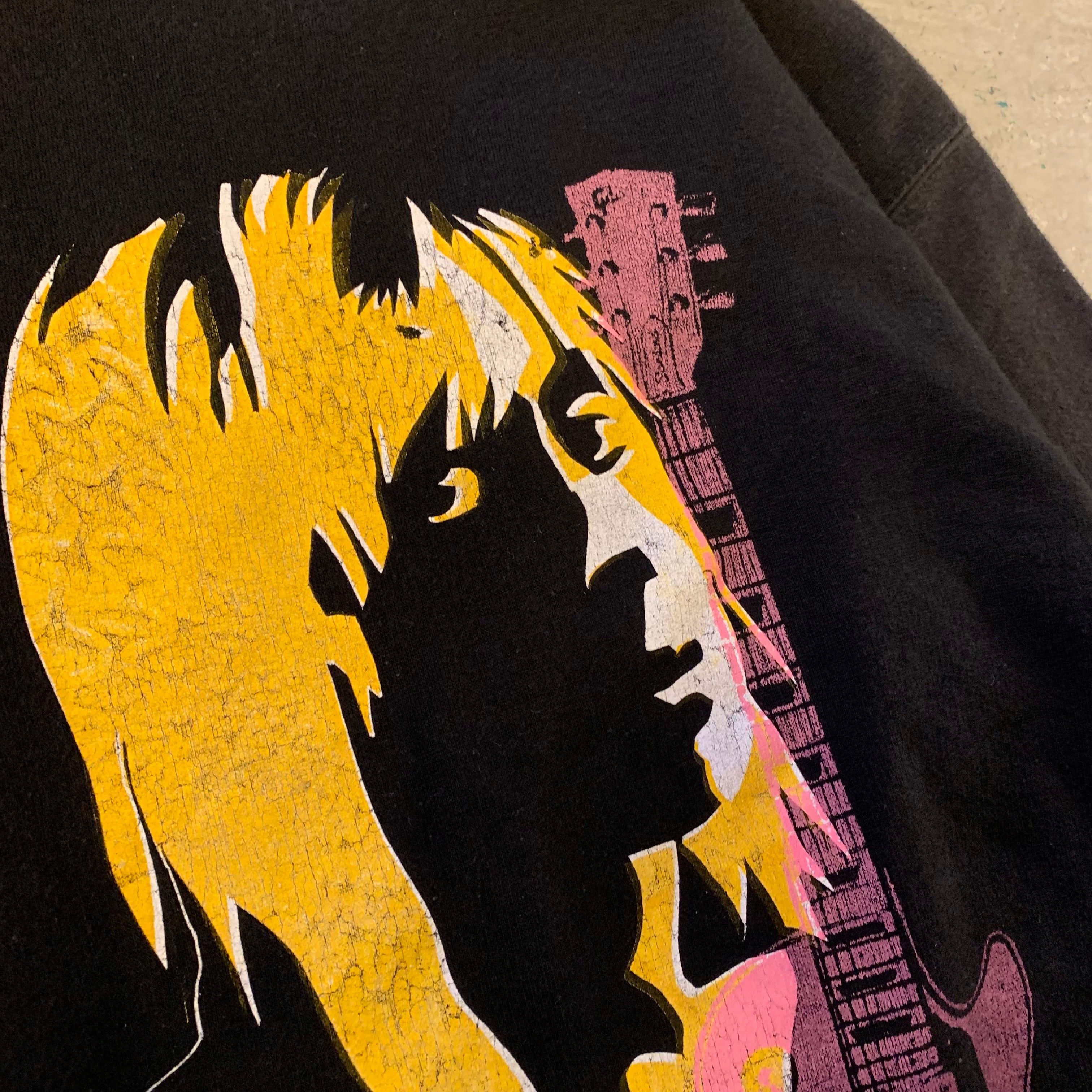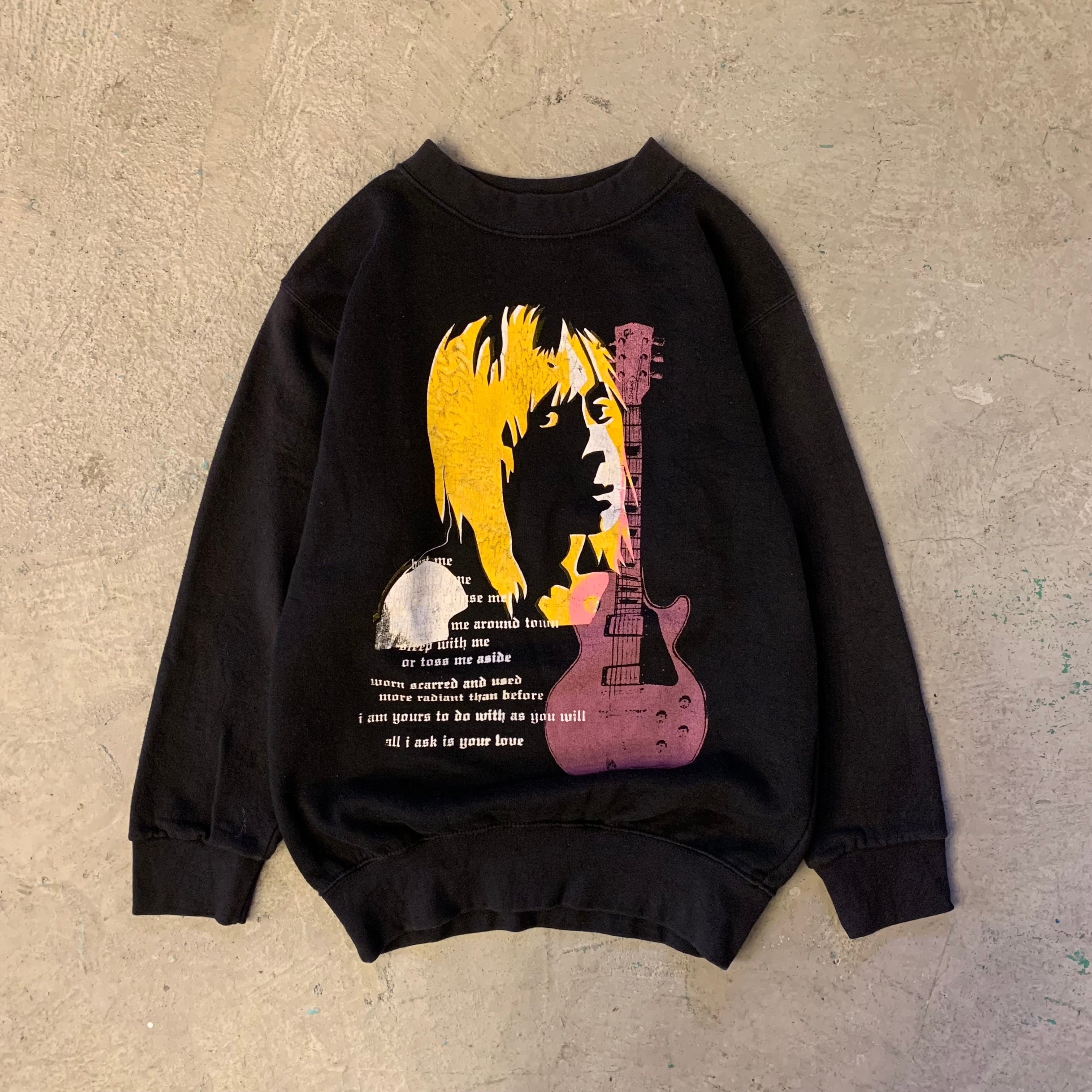 イギーのポートレートと、彼の楽曲の世界観を反映した「Take me around town / Sleep with me...」というエモーショナルなテキストが重なり合った、非常に希少なグラフィックデザイン。イエローのヘアとピンクのギターのコントラストが、ダークなボディに映える一着です。